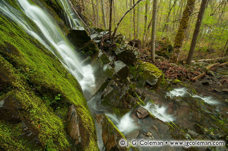 Neither the stream nor this exuberant waterfall along the Cathles Trail possess official names, probably because the warmer months of summer find them vanishing as their watershed is sapped of moisture. Come springtime, however, the falls are reborn as rains and meltwater cascade from the ridge and meander northwards to join Bissell Brook.