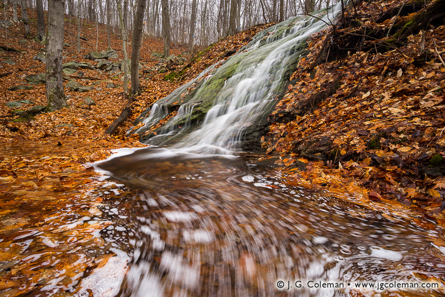 Carr Brook issues from the rugged hills of Meshomasic Forest, whispering with delight as it tumbles some 15 feet over a remote, forest-crowded knoll.